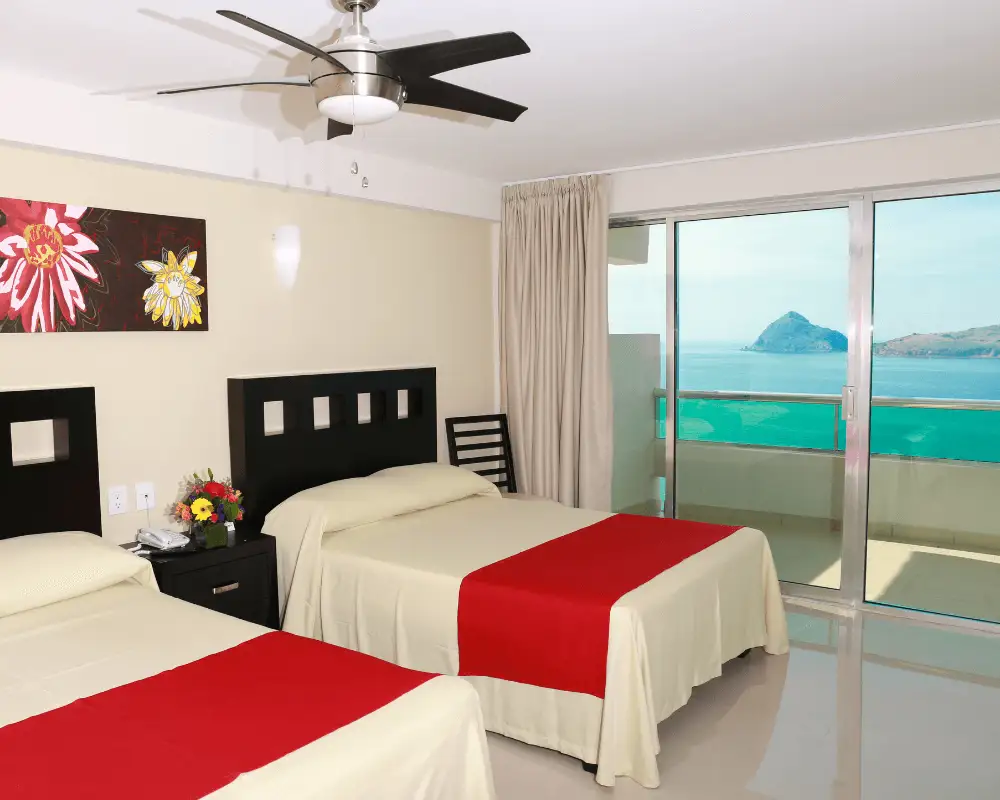 Features two double beds, air conditioning, bathroom, cable TV, iron, hair dryer, alarm clock, telephone, with some rooms offering ocean views and others city views.