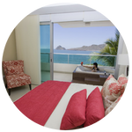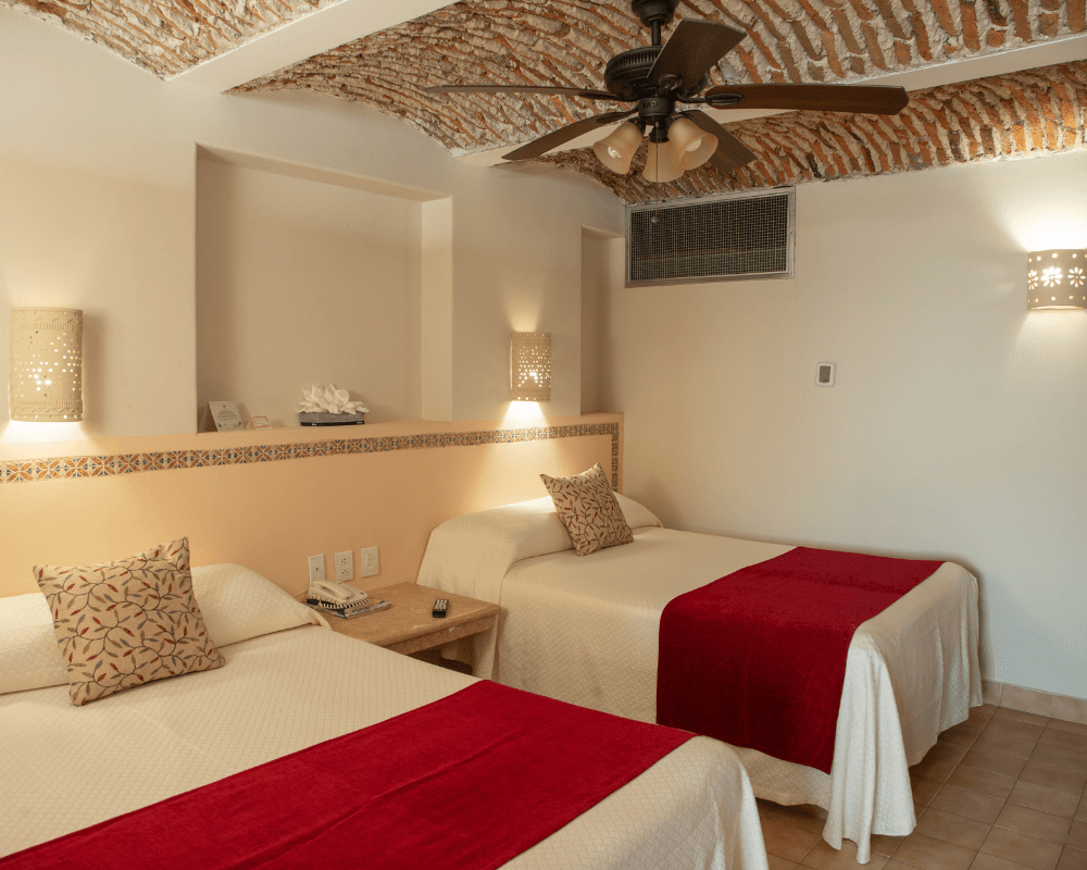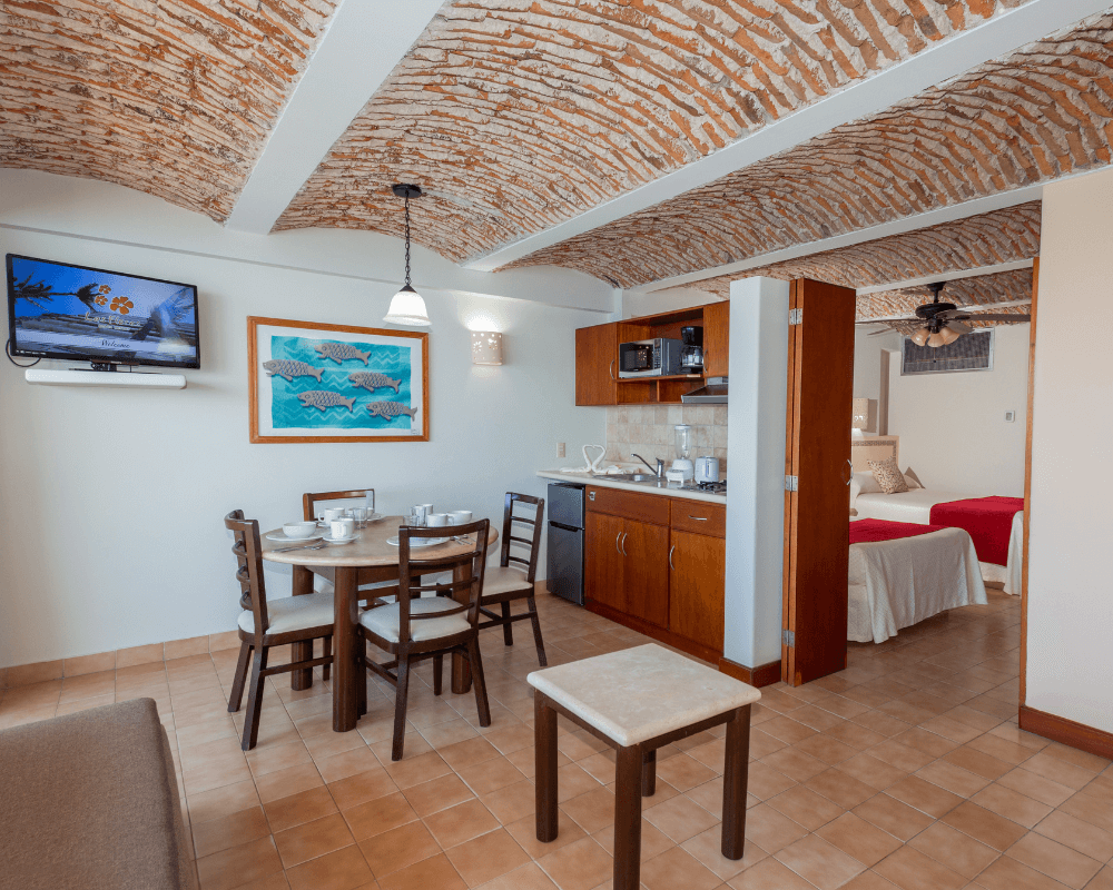 Habitación suite, cuenta con una recámara con dos camas matrimoniales, sala con dos sofás que se pueden utilizar como cama individual, aire acondicionado, baño, televisión por cable, teléfono, plancha, secadora para cabello, reloj alarma, cocineta totalmente equipada, licuadora, microondas, cafetera, tostador, parrilla con dos quemadores, refrigerador y balcón con vista al mar.